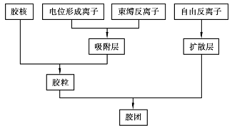 胶体分子聚合而成的胶体颗粒称为胶核,胶核表面吸附了某种离子(电位形成离子)而带电。由于静电引力的作用,溶液中的异号离子(反离子)就会被吸引到胶体颗粒周围。这些异号离子会同时受到两种力的作用而形成双电层。双电层是指胶体颗粒表面所吸附的阴阳离子层。