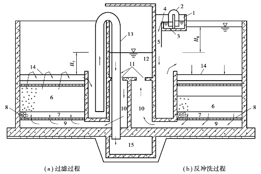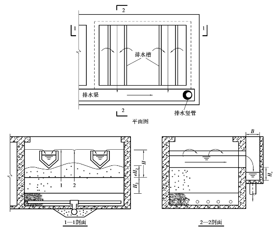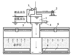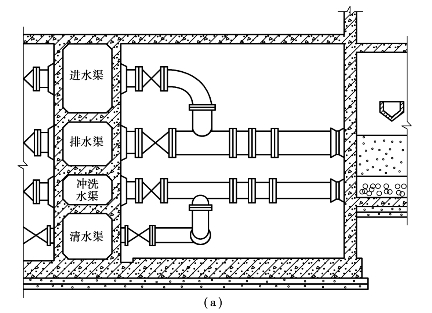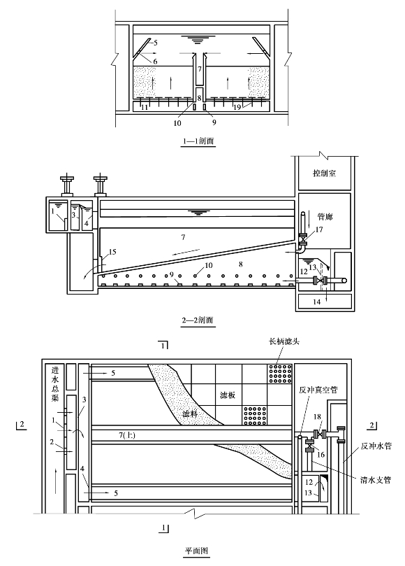 直接过滤工艺又可以分为在过滤前设置絮凝设施和不设置两种情况。过滤前设置絮凝设施,是在原水加注混凝剂后,经快速的混合而流入絮凝池,在池中形成一定大小的絮凝体,之后进入快滤池。不设置絮凝设施,是采用煤、砂双层滤料,原水加注混凝剂并经快速混合后,直接进入滤池。这种情况中的絮凝过程是在滤层中进行的。加注混凝剂的原水悬浮物在煤层中一方面完成絮凝过程,同时也被部分截除,而在砂层中被充分去除掉。