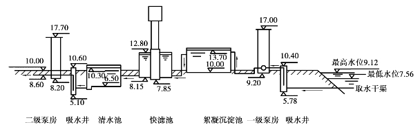 多砂高浊度水一般见于长江上游各江河中,稳定泥砂以及含砂量的比例较小,砂粒比较容易下沉,并且取水可以保证。故一般不设置调蓄水库,采用的工艺流程为二级或三级絮凝沉淀,如图2.84所示。
