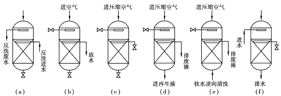 离子交换反应为可逆反应,当树脂失效以后,利用高浓度再生液(Na+或H+)使交换反应逆向进行,Na+和H+把树脂上吸附的Ca2+、Mg2+置换出来,从而使树脂重新恢复交换能力,这个过程称为树脂再生。