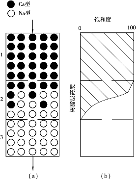 图3.11所示为树脂饱和度示意中白点表示钠型树脂、黑点表示钙型树脂),树脂饱和度是指单位体积树脂所吸附的Ca2+、Mg2+的含量与其全交换容量之比。若把整个树脂层各点的饱和程度连成曲线,可绘得某一时刻的饱和度曲线,如图3.11(b)所示。