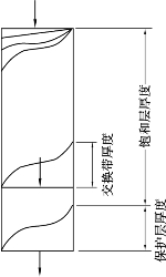 就整个离子交换过程而言,可分成两个阶段。一是交换带形成阶段,发生在交换开始的一段不长时间内,在此阶段内,树脂的饱和度曲线不断发生变化,直至形成一定形状的曲线,二是交换带推移阶段,即交换带以一定速度沿着水流方向向下推移的过程。交换带为交换柱中正在进行离子交换反应的区域,称之为树脂交换工作层。交换带推移阶段实际上就是树脂交换工作层沿水流方向不断向下移动的过程,当交换带(即树脂交换工作层)下端推移到达整个树脂层底部时,Ca2+、Mg2+开始泄漏,应立即停止交换,进行再生。此时整个树脂层可分成饱和层和保护层两部分,前者树脂交换容量得到充分利用,后者树脂交换容量只是部分被利用。可见,交换带厚度相当于此时的保护层厚度,如图3.12所示。