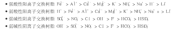 ④选择性。树脂对水中不同离子进行交换反应时,由于树脂和各种离子之间亲合力的大小不同,交换树脂存在着对各种离子交换的选择顺序。它与树脂类型、水中离子的种类、浓度及温度等因素有关。在常温、低浓度水溶液中,各种离子交换树脂对水中常见离子的选择顺序为: