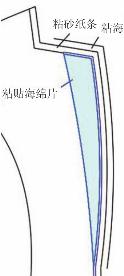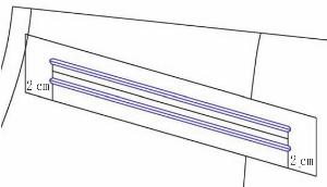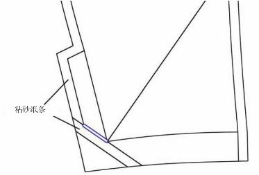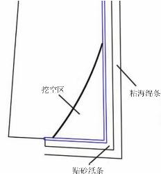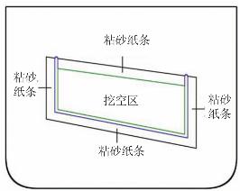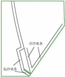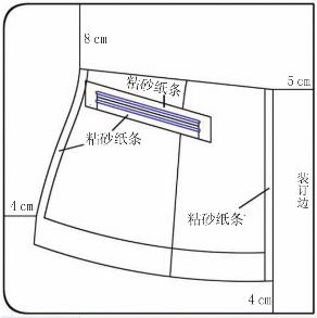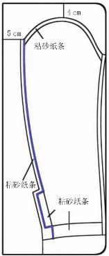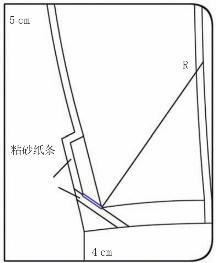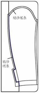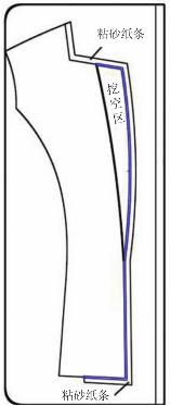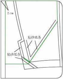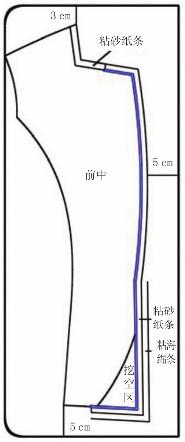 第一层模板摆放大袖片,沿开槽线设计槽宽、端延及粘贴砂纸条位置和安全位等。如图6.56、图6.57所示。