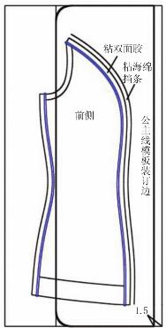 第二层模板是摆放前中衣片的模板,开槽线设计与第一层模板相同,切掉部分侧片,在公主线旁边画出粘贴双面胶和海绵挡条的位置。装订边偏进1.5 cm。如图6.15所示。