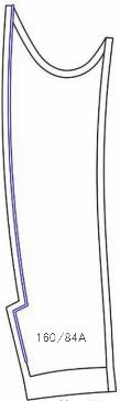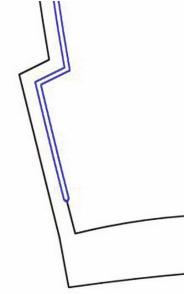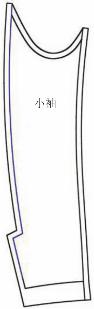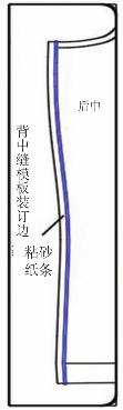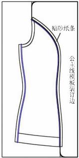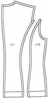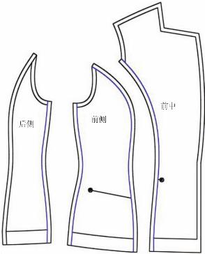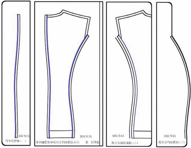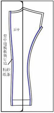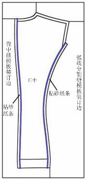 衣片加缝处理。后衣片缝制包括背中缝的缝合与左右两弧形分割缝的缝合,模板设计时以背中衣片为基础来设计模板,蓝色线为开槽线(缝合线)。如图6.22所示。