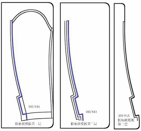 西服袖衩模板是一个多层模板,用于两片圆装袖后袖缝的缝制。大、小袖片后袖缝弧线形状不同,设计原理与公主线模板设计原理相同。袖衩工艺有假袖衩和真袖衩两种。工艺不同,其工艺模板也不同。