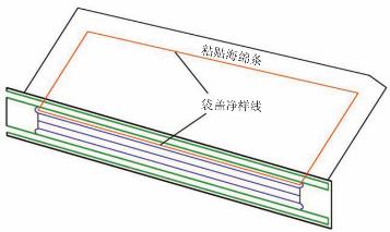 第二层模板摆放免烫嵌条和袋盖。模板设计时首先复制一个第一层模板,在复制模板上主要设计免烫条,画出袋盖粘贴海绵挡条位置,装订边偏进0.15 cm为第二层模板装订边线。
