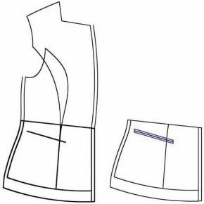 模板设计前首先进行衣片处理,将前公主线在腰节线以下部分旋转合并,模拟为公主线缝合;连顺袋口线,袋口宽1 cm(上下袋唇各0.5 cm),蓝色线为开槽线。衣片加缝份,确定模板开袋时衣片摆放的准确位置。在腰节线附近将衣片切断,以下半部分作为模板设计的依据。如图6.35所示。