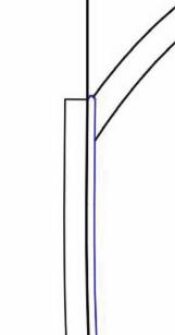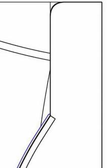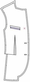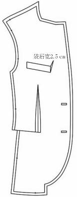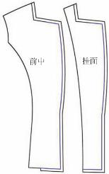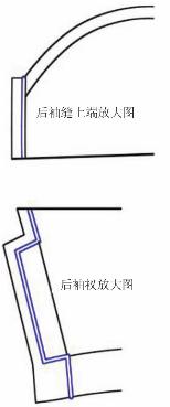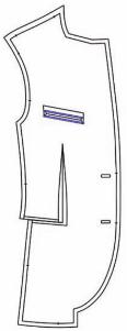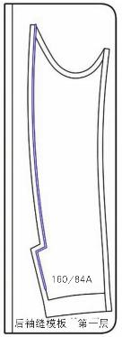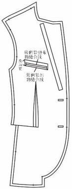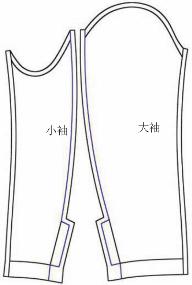 大袖片和小袖片后袖缝,沿图中蓝色线缝制。后袖缝假袖衩模板进行设计时,以大袖片为基础进行,蓝色线为开槽线。如图6.55所示。