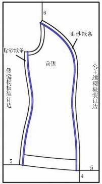操作程序如图6.13所示。前中蓝色线与侧片蓝色线缝合。两者的弧线形状不同,模板设计时应以前侧衣片上的公主弧线设计为开槽线,缝制时前中衣片弧线用双面胶粘合固定。如果前后侧缝用模板缝制,可以把侧缝也设计为开槽线。