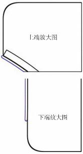 第三层模板是压住公主线缝头起固定作用的模板。复制第一层模板,以开槽线最里边的槽宽线两端上下作垂线与模板边框线相交,形成第三层模板的边框线。如图6.16所示。图6.17为上下端的放大图。