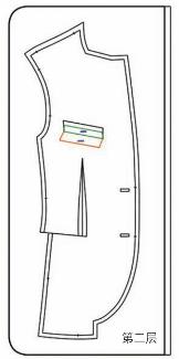 第二层模板设计时,首先复制第一层模板,自袖窿分割处作直线,沿直线切掉部分模板。装订边偏进1.5 cm,画出粘海绵条和双面胶位置。完成第二层模板设计。