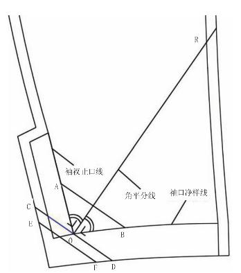 ②从O点作OR的垂线OC与袖衩放缝线相交。从O点作0R的垂线OD与袖口放缝线相交。