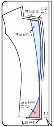 第二层模板放置挂面;驳头处正面粘贴海绵层,下摆圆角处反面粘贴海绵层(两处粘贴海绵层不在同一个面上)。如图6.93所示。