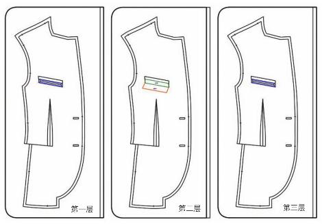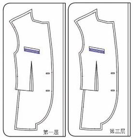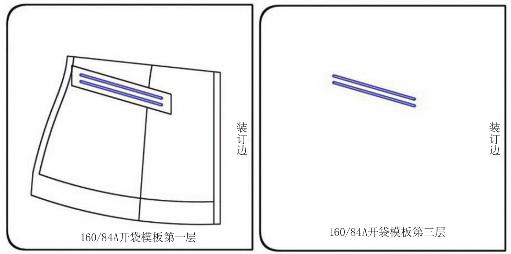 开袋工艺是在前公主线缝合后进行的工艺程序。西服的开袋方法与裤子的开袋方法相同,模板设计方法也相同,是一个多层模板。