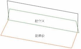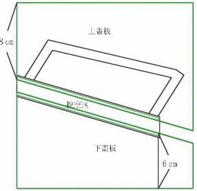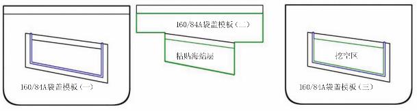 上盖板设计时沿挖空区上边线最高点向上作垂线8 cm左右,画一个四边形,能够盖住袋盖即可;下盖板设计时沿挖空区下边线最低点下行作垂线6 cm左右,画一个四边形,与上盖板对齐,完成下盖板的设计。下图绿色线为盖板轮廓线。如图6.42所示。两层块盖板粘贴在第二层模板上。