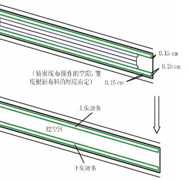 说明:为了方便缝制操作,嵌线裁剪时需要裁剪宽一些,缝制后再修剪。