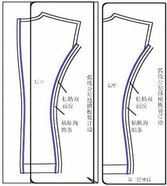 背中缝左右对称,弧线造型完全一致,背中缝模板只需要设计成两层模板就可以完成背中缝的缝制。