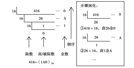 例1:将十进制数416转化为十六进制数的过程如图1-2所示。