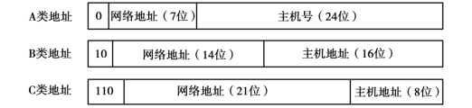 IP地址分为A、B、C、D及E共5类,其中A类、B类、C类为基本地址,D类地址为组播(Multicast)地址,E类地址保留给将来使用。A类、B类、C类基本地址的格式如图2-4所示。