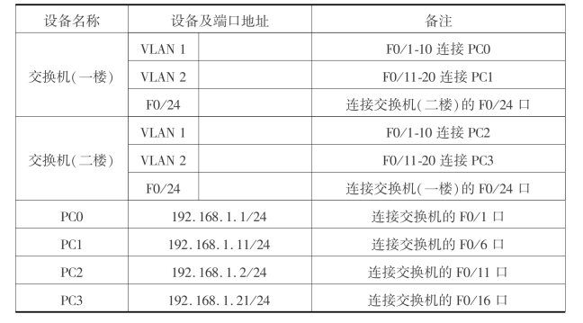 在PACKET TRACER软件中使用交换机2950-24搭建,如图3-14所示网络拓扑,设备连接及地址见表3-2。