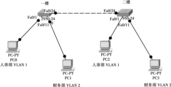 某公司办公楼一楼有若干台计算机分属人事部和财务部两个部门,二楼情况相似。一楼所有计算机接入一台交换机,二楼所有计算机接入另一台交换机,两台交换机通过网口相连,所有计算机使用同一网段的IP地址。为隔离部门之间的通信,网络管理员在两台交换机上均已采用了基于端口划分的虚拟局域网(VLAN)技术。此时,同楼层同部门的计算机能够相互通信,同楼层不同部门的计算机不能相互通信,而跨楼层同部门或不同部门的计算机均无法相互通信。显然需要实现跨楼层(跨交换机)同部门的计算机之间的相互通信。