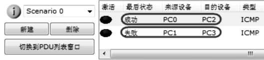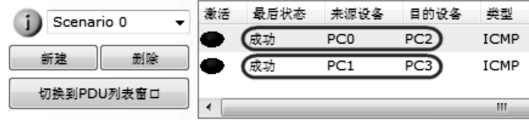 此时,一楼交换机的f0/1-10口及f0/21-24口属于VLAN 1(交换机默认),f0/11-20口属于VLAN 2,二楼交换机端口与VLAN的关系同一楼。由于连接两交换机的f0/24口属于Access端口,属于VLAN 1,只允许VLAN 1的数据流通过,所以,PC0与PC2能实现跨交换机同VLAN通信,而PC1与PC3不能实现跨交换机同VLAN通信,如图3-15所示。