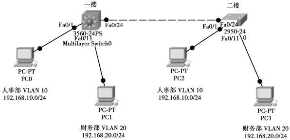 某公司办公楼一楼有若干台计算机分属人事部和财务部两个部门,二楼情况相似。人事部使用192.168.10.0/24网段,划入VLAN 10;财务部使用192.168.20.0/24网段,划入VLAN 20。一楼所有计算机接入一台三层交换机,二楼所有计算机接入另一台普通交换机,两台交换机通过网口相连。为隔离部门间的通信,保障部门内的通信,网络管理员在两台交换机上均已采用了基于端口划分的虚拟局域网(VLAN)技术,并配置了交换机与交换机互联的端口为Trunk口。从而达到了同部门的计算机能够相互通信,不同部门的计算机不能相互通信的目的。但是某天,财务部要求访问人事部获取最新人事信息,显然需要实现跨楼层不同VLAN(不同部门)的计算机之间的相互通信。