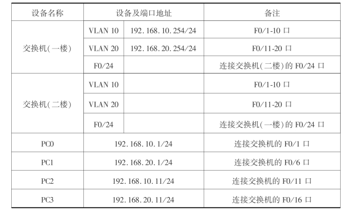 在PACKET TRACER软件中使用一台三层交换机3560-24PS和一台普通交换机2950-24搭建,如图3-21所示网络拓扑,设备连接及端口地址见表3-4。