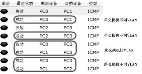 测试不同网络环境下计算机的相互通信,完成了跨交换机不同VLAN计算机的相互通信,结果如图3-22所示。