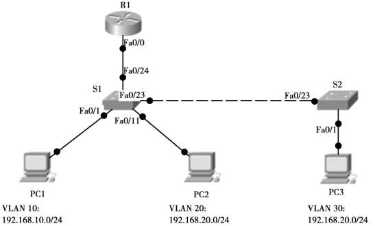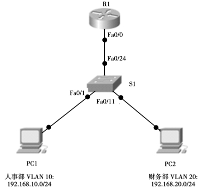 某公司办公楼一楼有若干台计算机分属人事部和财务部两个部门,所有计算机接入一台二层交换机,人事部使用192.168.10.0/24网段,划入VLAN 10;财务部使用192.168.20. 0/24网段,划入VLAN 20。网络管理员在交换机上采用了基于端口划分的虚拟局域网(VLAN)技术,从而达到了同部门的计算机能够相互通信,不同部门的计算机不能相互通信的目的。某天,财务部要求访问人事部获取最新人员信息,显然需要实现不同VLAN(不同部门)的计算机之间的相互通信,公司并没有三层交换机,无法实现交换机虚拟端口(SVI)技术,但是公司有一台暂未使用的路由器,本着节约的原则,网络管理员考虑采用单臂路由技术来实现不同VLAN之间的通信。