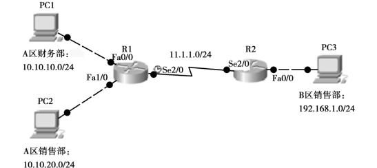 某超市新开分店,原超市网络为A区,使用财务部10.10.10.0/24和销售部10.10.20. 0/24两个网段;新店网络为B区,销售部使用192.168.1.0/24网段。为了实现两个店区网络互联,网络管理员使用两个路由器,通过高速同步串口(Serial)连接两个店区,在路由器上配置OSPF动态路由协议实现了多园区的网络互联。但是,相关人员希望A区、B区销售部数据独立,互不访问,只允许A区财务部能访问到所有销售部数据。