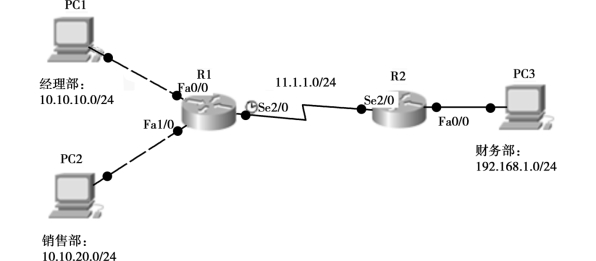 说明:如果A区销售部访问B区销售部,其数据流相对于R2的F0/0口是流出,所以此标准ACL的作用是在路由器R2的F0/0口对流出的数据包作过滤,如果数据包源地址为10.10.10.0/24,则允许经F0/0口流出(相当于允许A区财务部访问B区销售部),否则, ACL列表规则中的最后一条隐含规则deny all将禁止其他任何数据包从F0/0口流出,实际上就是禁止了源地址为10.10.20.0/24的终端访问192.168.1.0/24网段(相当于禁止A区销售部访问B区销售部,数据包访问是相互的,所以B区销售部也无法访问A区销售部)。