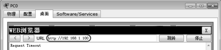 从PC0上使用内网IP地址(192.168.1.100)试图访问服务器的WWW服务,结果显然无法实现,如图6-3所示。