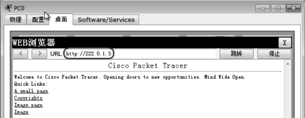 表6-1所示为配置PC0和WWW SERVER的IP地址、子网掩码和网关地址,进行WWW服务器连通测试。单击计算机PC0,再从“桌面”中选择“WEB浏览器”,在URL地址框内填入“222.0.1.3”后单击“跳转”,成功访问SERVER服务器上的WWW服务,如图6-2所示。