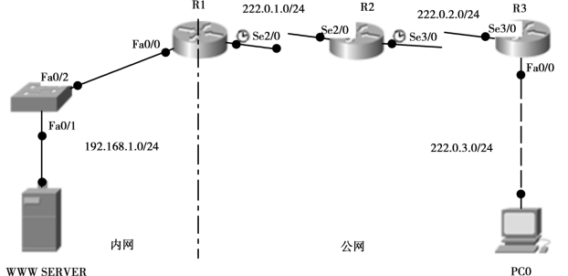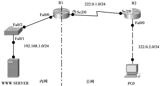 (7)在路由器R1上作NAT转换,使得PC0能使用R1的出口地址222.0.1.1/24访问到内网WWW SERVER服务器。
