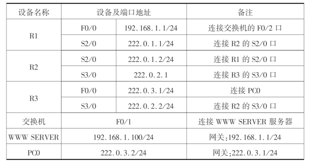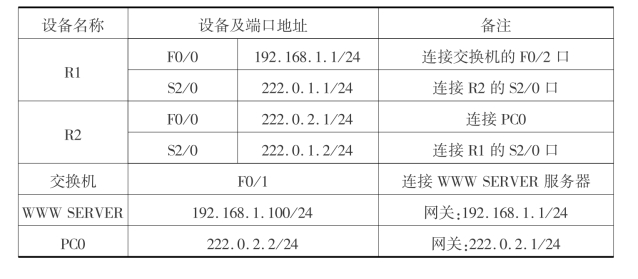 在完成本任务的过程中须注意两点:①内网IP地址段是不能被公网上的路由器路由的,如路由器R1上配置路由时不应该宣告192.168.1.0/24内网私有地址段。②本任务使用了222.0.1.3/24这个公网IP地址作为内网服务器192.168.1.100/24地址的映射,其实还可用内网的出口IP地址(222.0.1.1)作为内网服务器192.168.1.100/24地址的映射,从而节约一个地址空间。请自行尝试配置。
