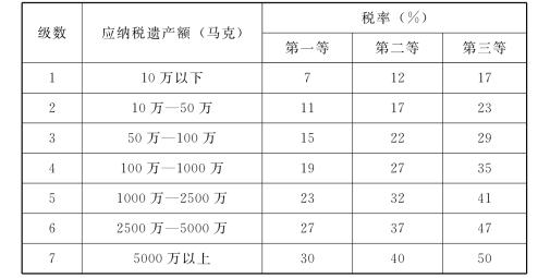 根据继承人与被继承人、受赠人与赠与人的亲疏关系,德国的遗产税设置了三个税率等级,均实行7级超额累进税率。详见表3-6所示。