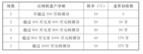 遗产税的主要作用在于抑制贫富差距的扩大,税率要体现社会公平原则,为此,世界各国遗产税基本采用能够体现量能纳税原则的超额累进税率。我国遗产税税率也应采取超额累进税率,但级数不应过多,应尽量简化税制。由于继承的遗产属于偶然所得,因此遗产税税率一般要高于个人所得税的税率,但把最高边际税率设定过高,甚至达到80%、90%又是不合适的,因为这种基本没收遗产的政策可能达不到多收税从而调节财富分配的目的,只会引起纳税人的反感。赠与税和遗产税合并征收,因此赠与税与遗产税的税率结构是一样的。我国我国遗赠税税率表可见表6-1所示。