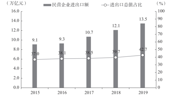 “一带一路”倡议提出6 年来,民营企业坚持以市场为导向、以项目合作为载体,积极参与国际竞争和全球资源配置,拓展发展空间,打造增长动力。2019 年,民营企业进出口额13.5 万亿元,增长11.4%,占我国外贸总值的42.7%,比2018 年提升3 个百分点(见图11)。民营企业首次超过外商投资企业,成为我国第一大外贸主体。