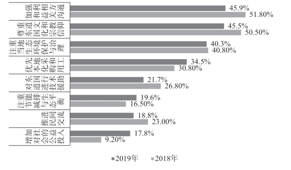 海外履责领域受“软要求”和“硬约束”影响不同走向两极。调研发现,民营企业在加强利益相关方沟通、尊重东道国文化和宗教信仰、对东道国进行技术援助以及推进民间交流方面有小幅下降,但在优化本地化采购和用工、注重节能减排和生态平衡、增加对社会的公益投入方面均有所增长,反映出民营企业在“软要求”的责任履行方面维持欠佳,但“硬约束”方面表现较好,尤其是在政府特别强调并具体指导的领域。2018 年11 月,《“一带一路”绿色投资原则》发布,在现有投资责任的基础上,提倡将低碳和可持续发展议题融入“一带一路”建设,以提升项目投资的环境和社会风险管理水平,推动“一带一路”投资的绿色化。受此影响,民营企业在注重当地生态环境保护与治理、注重节能减排与生态平衡方面保持较好并有所提升,说明政策引导的“硬约束”对于提升民营企业海外履责至关重要。