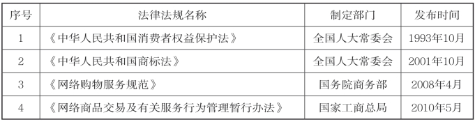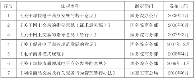 电子商务作为新业态,有逐渐成长、成熟的过程。相关的法规建设已在逐渐完善。在《电子商务法》出台之前,国务院办公厅、商务部等也出台了相关的法规来规范电子商务行为。同时电子商务作为商务行为,相关的法律也同样有效。电子商务类法规见表1-2-2,网络购物类法律法规见表1-2-3,电子支付类管理办法见表1-2-4。