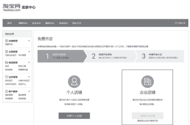 如果要在淘宝上申请企业店铺,则必须先申请一个淘宝企业账号,以该企业账号登录淘宝后,才有资格申请企业店铺,如图4-2-8所示。