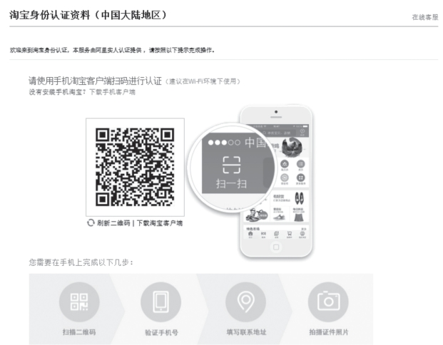 (5)单击“立即认证”,在身份认证页面中使用手机淘宝客户端扫码进行认证,如图4-2-7所示,需验证手机号,填写联系地址,拍摄证件照片后提交申请。一般情况下,提交后的申请会在3天左右审核通过,创建店铺成功。