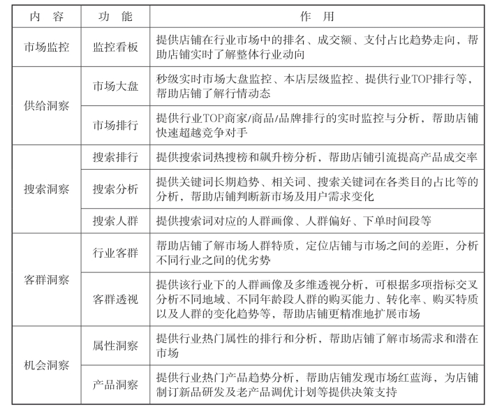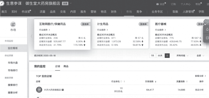 生意参谋:淘宝网的数据分析工具,是淘宝网通过抓取买家及卖家在淘宝网中的交易数据而为卖家提供运营上的数据参考的工具(可获取买卖双方的流量、品类、交易、内容、营销、市场、竞争等数据)。生意参谋的市场分析板块包含市场监控、供给洞察、搜索洞察、客群洞察、机会洞察5个内容,各自的作用见表5-2-1。如图5-2-2所示为御生堂大药房的市场数据截图。