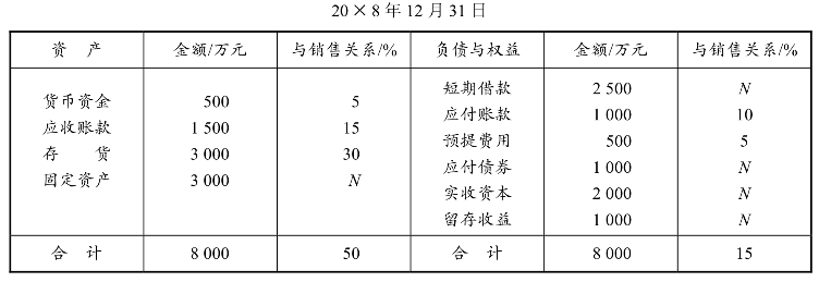 首先,确定有关项目及其与销售额的关系百分比。在表1−1中,N为不变动,是指该项目不随销售的变化而变化。