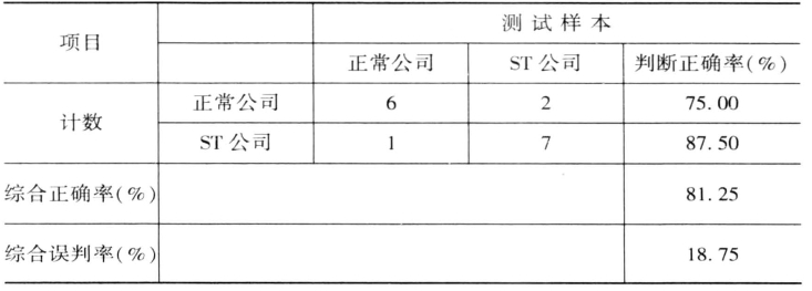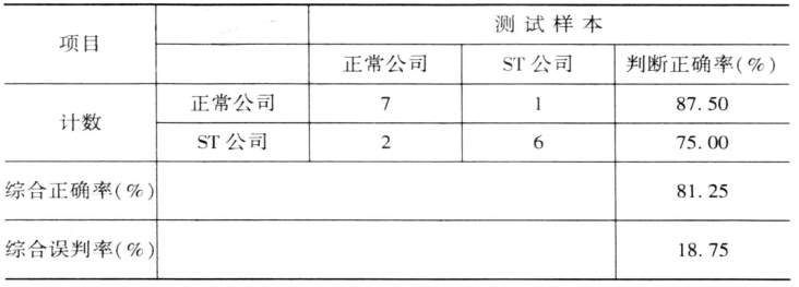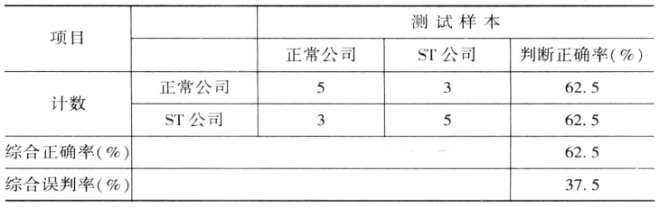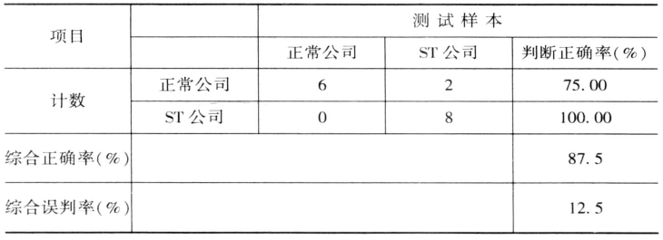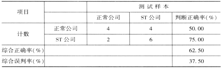 从以上预测结果可以发现:从ST前1年至ST前5年,信息技术业Logistic回归模型对于测试样本预测综合正确率分别为81.25%、87.5%、81.25%、62.5%、62.5%,与前面开发样本的判定准确率非常接近,并且各年都高于设定的先验概率,预测结果都可以接受。除ST前2年稍微偏高外,预测结果基本上可以得出离财务危机发生的时间越远、模型判定准确率越低的结论。并且从ST前4年开始,预测判定的综合正确率显著降低。