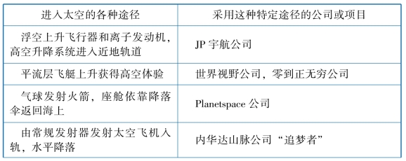 很多研制空天飞机的提议都始于XPRIZE 大赛,关于这些系统如何起飞和降落的概念方案呈现了令人难以置信的多样性。表12.2 所示为仅在美国范围内由XPRIZE 启发出的以更好、更经济的方法来开创空天飞机业务的提议。有些人可能会认为这个过程极其低效。但是,这种很大程度上受XPRIZE 大赛启发的竞争性思维过程,已经淘汰了竞争力稍弱的想法和业务实践,留下了最强大的技术途径以继续推进[7]。