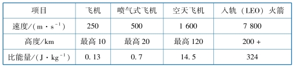 蓝色起源公司的志向远不止为太空游客提供亚轨道飞行航班。其“新格伦”火箭打算真正飞进太空。但是,从喷气式飞机到亚轨道太空飞机,再到能够将航天器送入轨道的运载火箭,这显然是艰难的转型。表12.1 从所需能量(以J/kg 表示)呈指数上升而不是直线上升的角度,显示了这种转型的挑战性[4]。